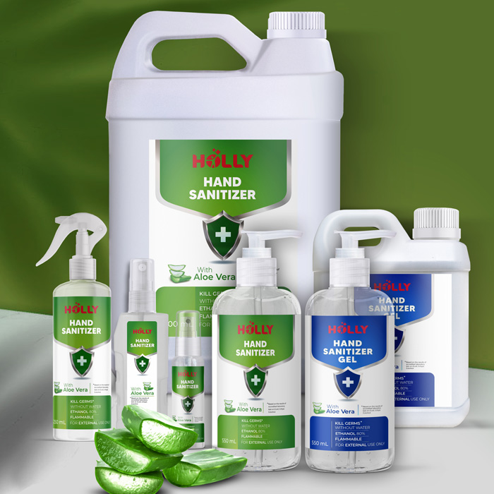 Holly Hand Sanitizer effectively kills germs and bacteria, contains extract aloe vera and glycerol to soften and moisturize hands. Various packaging variants making it easier to use in various conditions.